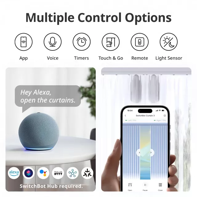 Whether you’re at home or away, enjoy total control through the Bluetooth app. Schedule automatic opening with the built-in timer—wake up to natural sunlight or close your curtains at sunset for privacy. For even more convenience, add a smart home hub to connect with voice assistants like Alexa, Google Home, or Apple HomeKit for true hands-free operation.